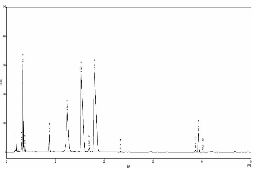 流動(dòng)相 A:0.01mol/L 醋酸銨/甲醇=99/1流動(dòng)相 B:0.01mol/L 醋酸銨/甲醇=70/30梯度:A(%):0min 99,30min 50,40min 0,50min 0,51min 99,65min 99.