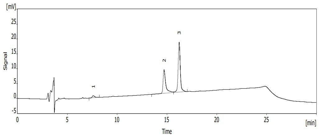 A:0.02mol/L 四甲基氫氧化銨溶液(用磷酸調(diào)節(jié) pH 至 2.5)-乙腈(9:1)B: 0.02mol/L 四甲基氫氧化銨溶液(用磷酸調(diào)節(jié) pH 至 2.5)-乙腈(2:3)梯度:A(%):0min 65,21min 43,21.01min 65,30min 65.B(%):0min 35,21min 57,21.01min 35,30min 35,