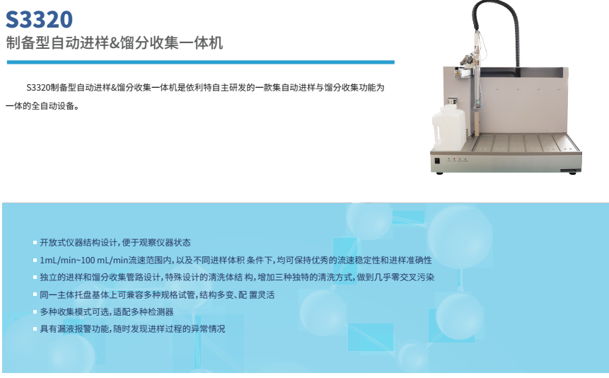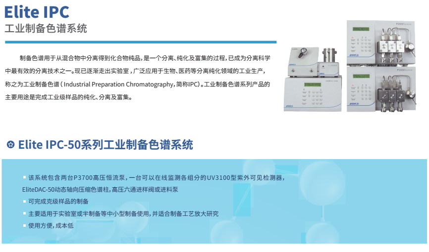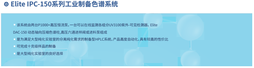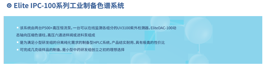 依利特科技高壓半制備液相色譜系統(tǒng)EClassical3500/3700,將分析和半制備一體化,為您提供完整的分析和制備化合物的自動(dòng)HPLC應(yīng)用方案。該系統(tǒng)可以方便實(shí)現(xiàn)分析與半制備系統(tǒng)之間的切換,還可完成樣品進(jìn)樣、餾分收集等功能。依利特工業(yè)制備Elite IPC色譜系統(tǒng),完成從幾克級(jí)至十克級(jí)樣品的制備,是小型藥物研發(fā)和大型純化實(shí)驗(yàn)室的良好選擇。
