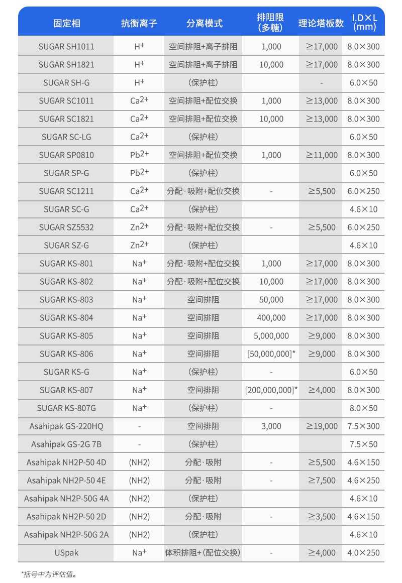 下表列舉了各種糖分別在7種不同的色譜柱(SUGAR SP0810,SC1011,KS-801,SZ5532,SC1211, Asahipak NH2P-50 4E和GS-220 HQ)