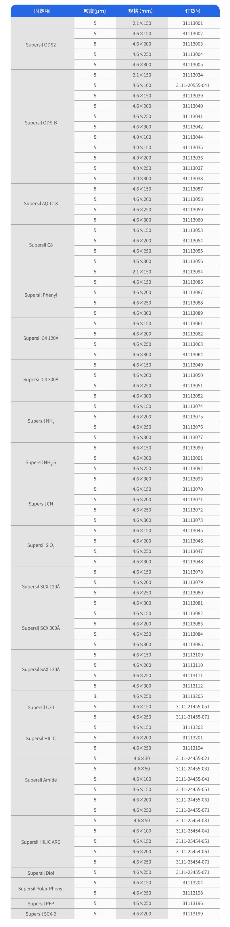 Supersil?系列色譜柱是大連依利特分析儀器有限公司集多年技術(shù)積累和經(jīng)驗(yàn)傳承,成功開(kāi)發(fā)的高效液相色譜(HPLC)色譜柱產(chǎn)品,是Hypersil系列色譜柱的全面升級(jí),其色譜分離效能更高、使用壽命更長(zhǎng)、批次差異性更小。Supersil系列色譜填料采用超純?nèi)嗫浊蛐喂枘z(純度>99.999%),具有良好的機(jī)械強(qiáng)度,孔徑及粒度分布均勻,極佳的批次間穩(wěn)定性。