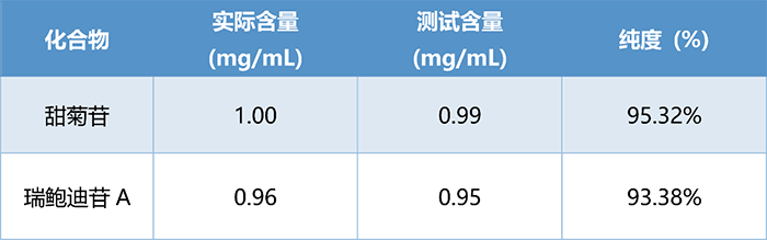 2、分離純化效能: 選擇甜菊糖苷中高價(jià)值組分——甜菊苷和瑞鮑迪苷A作為測(cè)試樣品,設(shè)備自動(dòng)進(jìn)樣10mL樣品,利用其時(shí)間+閾值方法精準(zhǔn)收集目標(biāo)餾分。如下表所示,純度均高于93%,相比文獻(xiàn)報(bào)道的傳統(tǒng)三步樹脂法(~92.9%)更具優(yōu)勢(shì)。證明了設(shè)備在快速分離、穩(wěn)定輸出、精準(zhǔn)收集上的卓越性能,顯著提升產(chǎn)品純度和效率。