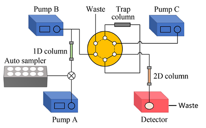 1、除雜質(zhì)過程:初始條件下,進樣后A泵工作,切換閥處于實線通路,從第一維色譜柱(1D column)上洗脫的非待測組分通過切換閥排入廢液流路。