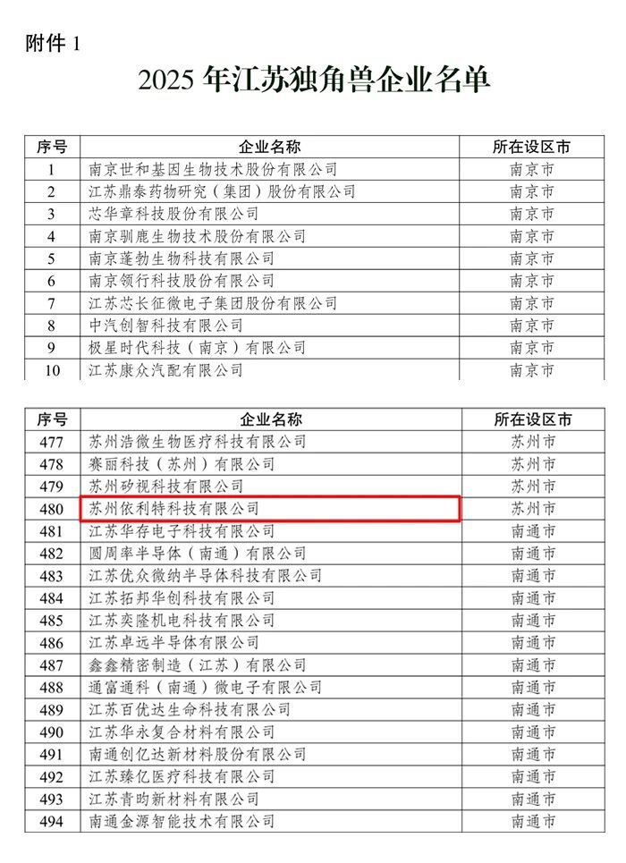 近日,江蘇省新質(zhì)生產(chǎn)力促進(jìn)中心正式發(fā)布《關(guān)于發(fā)布 2025 年江蘇獨(dú)角獸企業(yè)評(píng)估結(jié)果的通知》,經(jīng)過嚴(yán)格遴選與專業(yè)評(píng)估,蘇州依利特科技有限公司憑借在技術(shù)創(chuàng)新、產(chǎn)業(yè)潛力與高質(zhì)量發(fā)展貢獻(xiàn)方面的突出表現(xiàn),成功榮登 2025 年江蘇獨(dú)角獸企業(yè)名單,成為江蘇省高成長(zhǎng)企業(yè)群體中的代表之一。