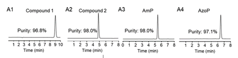通過依利特EClassical 3100液相色譜儀對AzoP、AmP的純度進行檢測,峰形良好,并且分離度高,并且測得的結(jié)果分別為:AmP的純度為98%,AzoP的純度為97.1%。