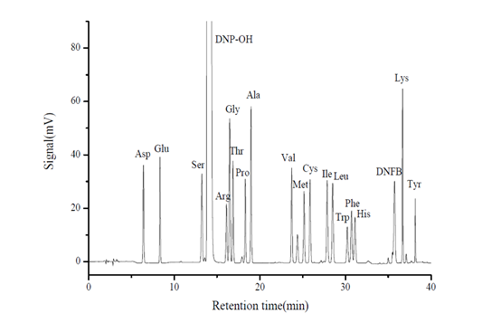 1.Asp天冬氨酸;2.Glu谷氨酸;3.Ser絲氨酸;4.DNP-OH2,4-二硝基苯酚;5.Arg精氨酸;6.Gly甘氨酸;7.Thr蘇氨酸;8.Pro脯氨酸;9.Ala丙氨酸;10.Val纈氨酸;11.Met蛋氨酸;12.Cys半胱氨酸;13.Ile異亮氨酸;14.Leu亮氨酸;15.Trp 色氨酸;16.Phe苯丙氨酸;17.His組氨酸;18.DNFB 2,4-二硝基氟苯;19.Lys賴氨酸;20.Tyr酪氨酸