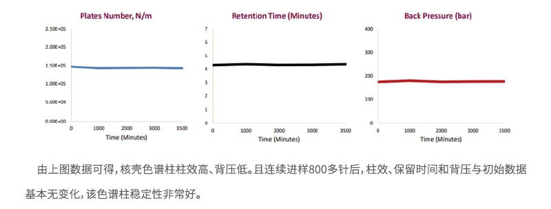 在相同的色譜條件下,核殼色譜柱可以超過大多數(shù)亞2μm多孔型色譜柱的柱效,且柱壓只有亞2μm多孔型色譜柱的一半。由于實(shí)心核的存在,樣品分子傳質(zhì)路徑短,極大的提高了分析速度。可以實(shí)現(xiàn)在常規(guī)HPLC上,獲得超高的柱效和更快的分離。