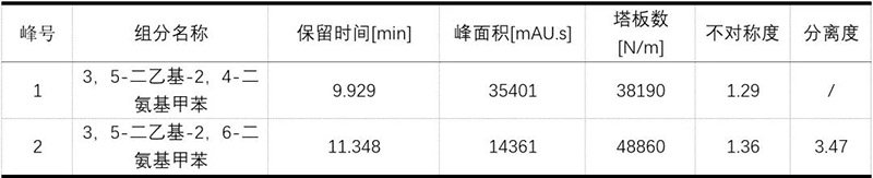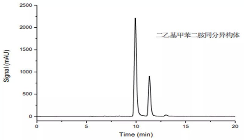 二乙基甲苯二胺是兩種異構(gòu)體混合物,即3,5-二乙基-2,4-二氨基甲苯和 3,5-二乙基-2,6-二氨基甲苯,簡稱DETDA,長期暴露在空氣中顏色會變深,二乙基甲苯二胺易燃,腐蝕性強(qiáng),皮膚、眼睛接觸能引起刺激和嚴(yán)重灼傷,誤服有害。依利特使用EClassical 3200液相色譜儀匹配經(jīng)典的SinoPak C18色譜柱,對二乙基甲苯二胺異構(gòu)體進(jìn)行分析檢測。