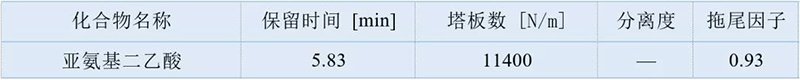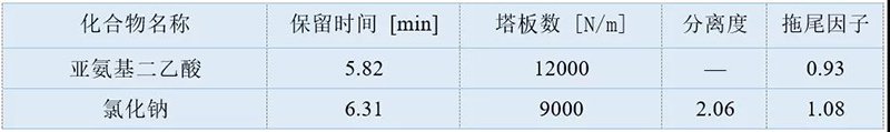 使用EClassical 3200高效液相色譜儀配Supersil SAX色譜柱分析亞氨基二乙酸及氯化鈉樣品溶液,柱效很高,且亞氨基二乙酸及氯化鈉峰分離度很好,滿足定性定量分析的需求。