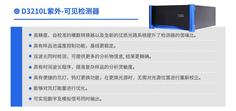 EClassical D3210L紫外-可見檢測(cè)器是依利特推出的 EClassical 3200L 系列產(chǎn)品之一。配備了氘燈和鎢燈兩種光源,增加了雙波長(zhǎng)功能。
