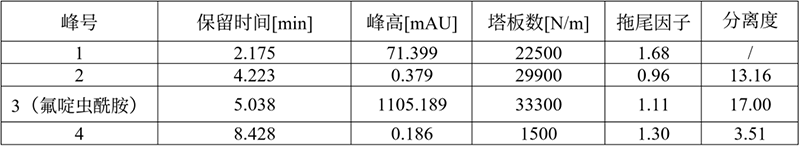 取25mg氟啶蟲酰胺樣品溶于50mL流動相中,超聲溶解后搖勻,用0.45μm的濾膜過濾后進(jìn)樣。