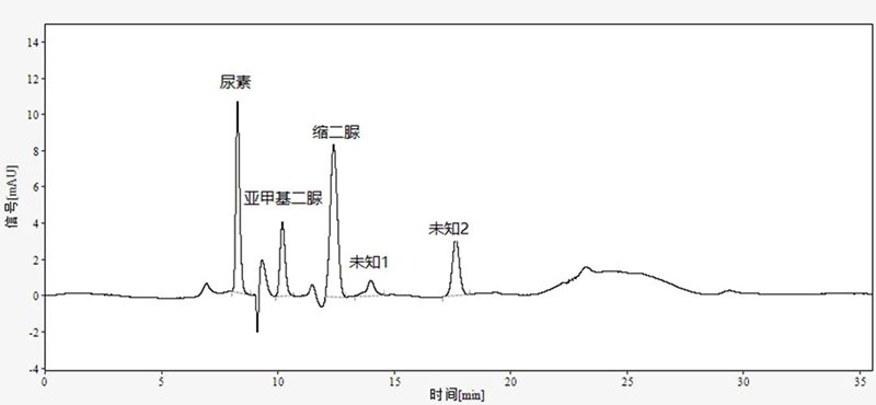 使用EClassical 3200液相色譜儀匹配SinoChrom ODS-BP色譜柱,對(duì)樣品進(jìn)行分析,尿素、亞甲基二脲、縮二脲等組分,其分離度均大于1.5,實(shí)現(xiàn)完全分離。