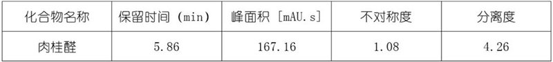 2)肉桂醛標準液的配制:取肉桂醛中間液250μL,加入3750μL乙腈,溶解混勻,過0.45μm濾膜,肉桂醛含量為50mg/L。