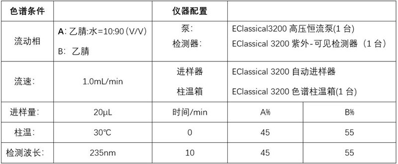 使用依利特EClassical 3200液相色譜儀匹配Supersil ODS2 色譜柱分析飼料中的肉桂醛,目標物峰形良好,可以與旁邊的相關(guān)物質(zhì)能達到良好的分離,滿足定量分析的需求。