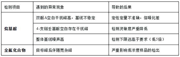 3.關(guān)鍵發(fā)現(xiàn):捕集柱是“元兇”:在排查全氟化合物的雜峰和烷基酚的高基線問題時(shí),通過對(duì)比試驗(yàn)發(fā)現(xiàn),系統(tǒng)中使用的某知名品牌捕集柱是引入干擾的根源。