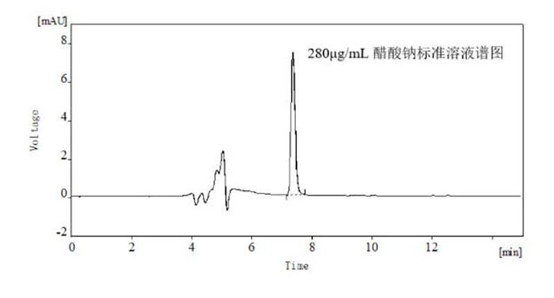 精準(zhǔn)稱取醋酸鈉25mg,精確至0.0001g,用水溶解,配制成1000μg/mL儲備液;并用水稀釋成120μg/mL、160μg/mL、200μg/mL、240μg/mL、280μg/mL的工作液。