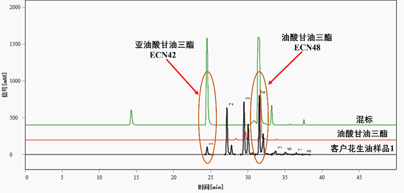圖2. 花生油樣品與油酸甘油三酯標(biāo)液以及甘油三酯混標(biāo)溶液的疊加色譜圖