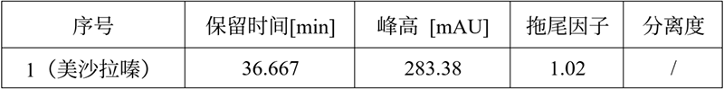 精確稱量美沙拉嗪樣品50mg到100mL的容量瓶中,加75mL流動(dòng)相,超聲溶解后用流動(dòng)相定容至刻度,搖勻,過濾膜,待進(jìn)樣。