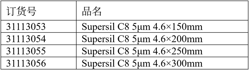 使用依利特最新的EClassical 3200高效液相色譜儀,搭配Supersil C8色譜柱,能很好的對(duì)目標(biāo)物進(jìn)行分析,且峰形良好,滿足定性定量分析的要求。