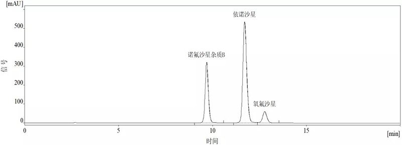 精確稱取依諾沙星標(biāo)準(zhǔn)品5mg、諾氟沙星雜質(zhì)B2.5mg、氧氟沙星2.5mg,置于同一100mL容量瓶中,加4mL0.1mol/L的鹽酸使溶解,加流動(dòng)相稀釋至刻度線,搖勻,即得。