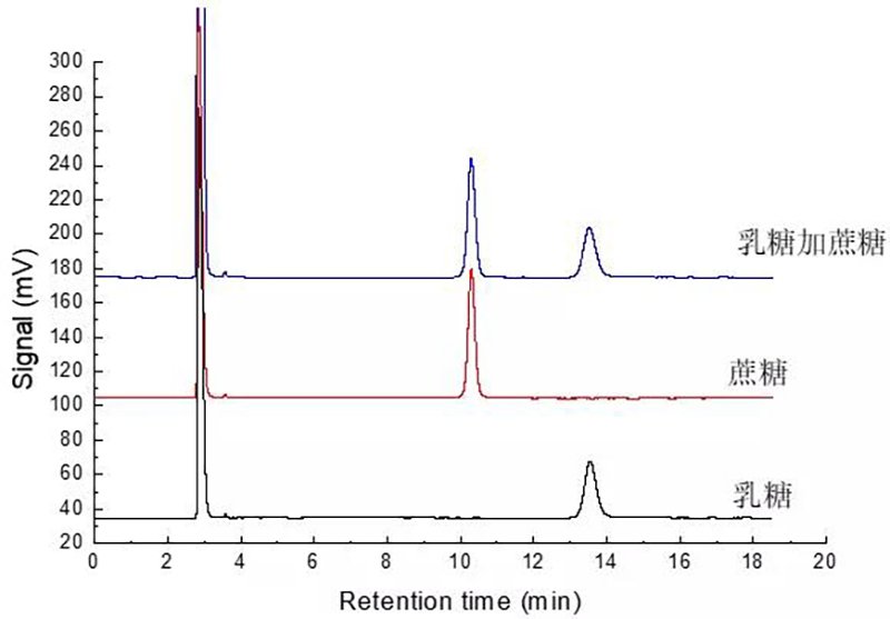 圖2 蔗糖及乳糖混合標準品,蔗糖,乳糖單標疊加色譜圖