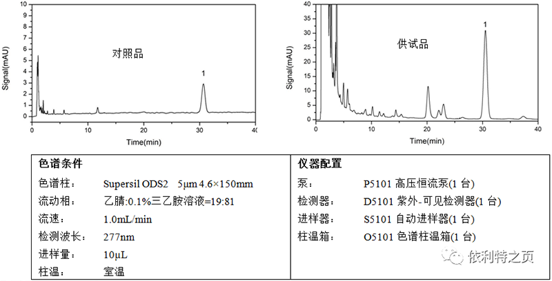 2.供試品溶液的制備:取裝量差異項下的本品,研細(xì),取約2g,精密稱定,精密加入甲醇50mL,稱定重量,超聲處理(功率360W,頻率50kHz)30分鐘,取出,放冷,稱定重量,用甲醇補(bǔ)足減失的重量,搖勻,濾過,精密量取續(xù)濾液25mL,加在中性氧化鋁柱(100~200目,15g,內(nèi)徑為1.5cm)上,用甲醇25mL洗脫,棄去洗脫液,再用80%甲醇100mL洗脫,收集洗脫液,蒸干,殘渣加流動相適量,超聲處理(功率360W,頻率50kHz)2分鐘使溶解,轉(zhuǎn)移至10mL量瓶中,加流動相至刻度,搖勻,濾過,取續(xù)濾液,即得。
