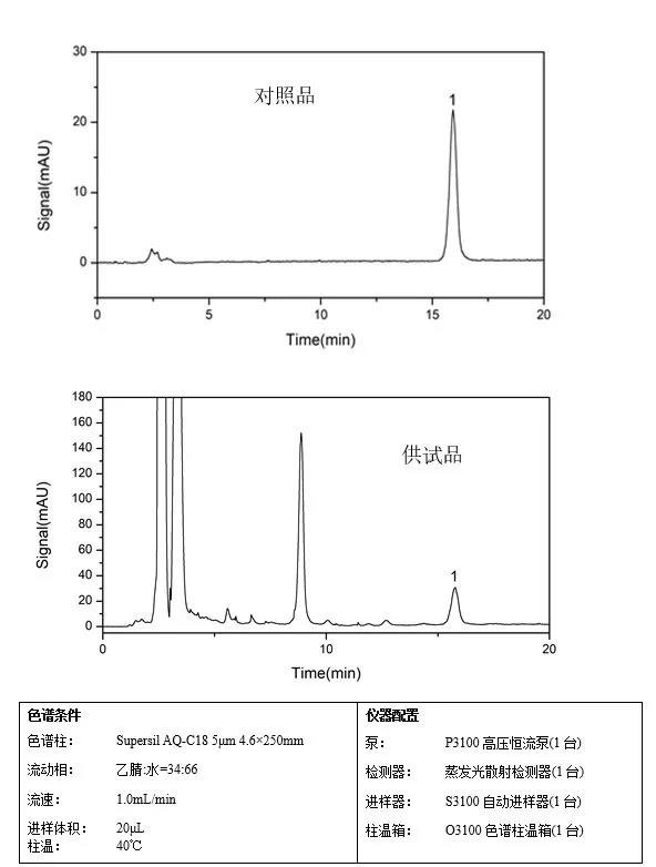 2.供試品溶液:取裝量差異項下的本品內(nèi)容物,混勻,滴丸取約0.7g,精密稱定,置10mL量瓶中,加4%氨溶液7mL,超聲處理(功率120W,頻率40kHz)20~25分鐘使充分溶散,放冷,用4%氨溶液稀釋至刻度,搖勻,以1mL/min的速度加在已處理好的C18固相萃取小柱(500mg,先以甲醇5mL預(yù)洗,再以水5mL預(yù)洗)上,以水5mL洗脫,棄去洗脫液,再用甲醇2mL緩慢洗脫至2mL量瓶中,加甲醇至刻度,搖勻,既得。